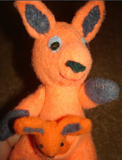 В нашем разноцветном зоопарке пополнение. Появились кенгуру с кенгуренком оранжевого цвета. Выкройку нашла в интернете здесь.
