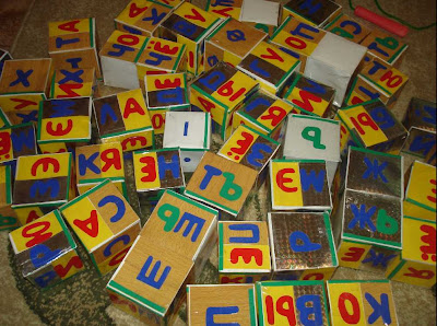 Раскладку кубиков нашла в интернете (ссылку увы не сохранила). Основа кубиков -ватман. Все буквы вырезаны из самоклеющей пленки, "заламинированы" скотчем.